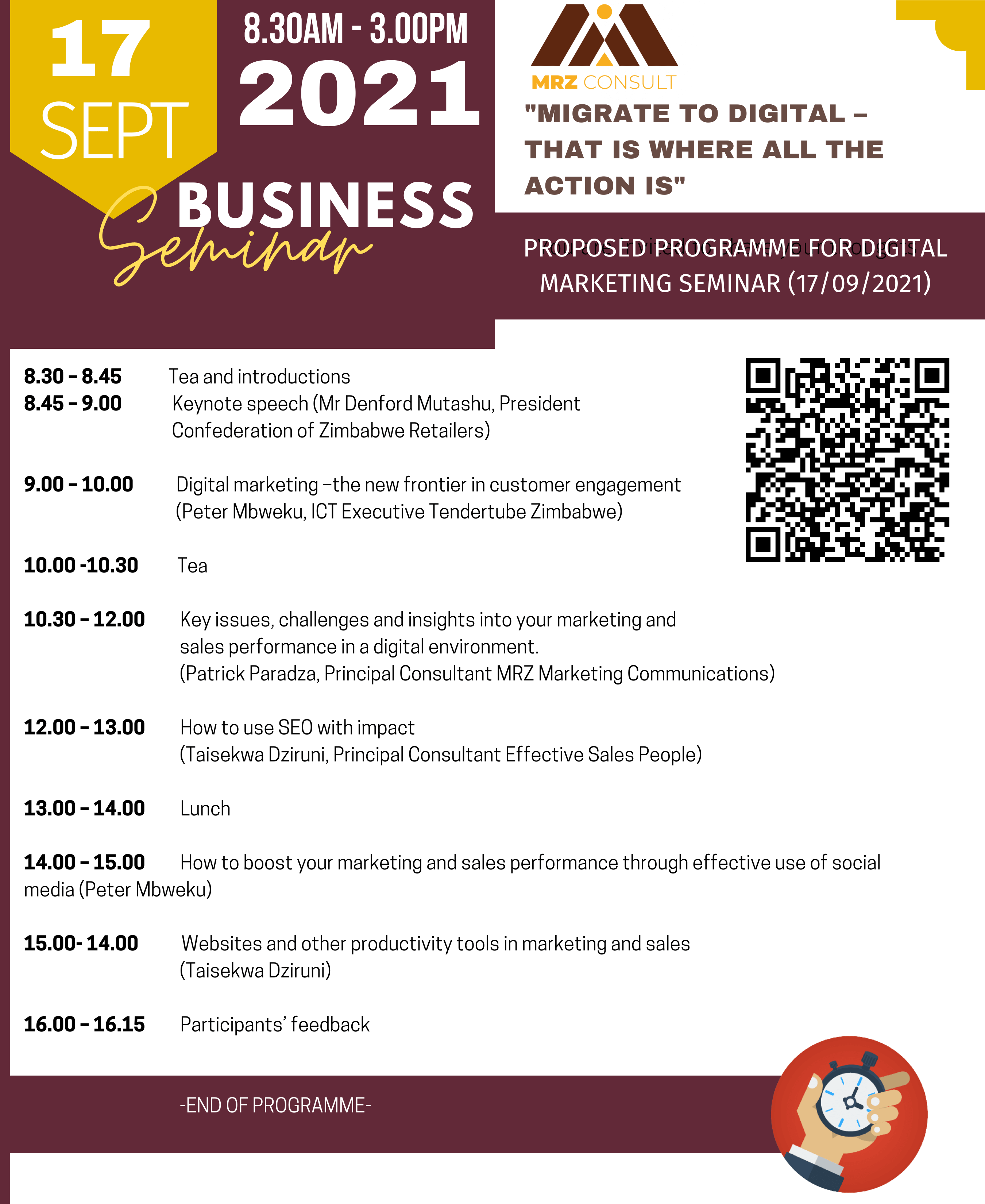 AT MRZ MARKETING SEMINARS, WE GO BEYOND THEORY TO GIVE THE CUTTING EDGE TO YOUR MARKETING OR SALES WORK OR THAT OF YOUR STAFF. WE HAVE AN ACTION-PACKED TRAINING PROGRAMME WHICH ADDRESSES ALL IMPORTANT ASPECTS OF THESE CRITICAL ASPECTS OF BUSINESS. OUR NEXT SEMINAR HAS THE THEME “MIGRATE TO DIGITAL – THAT IS WHERE ALL THE ACTION IS” AND WILL BE HELD ON FRIDAY 17 SEPTEMBER 2021.